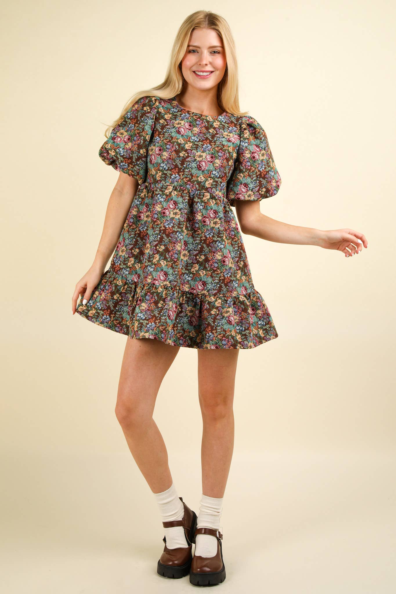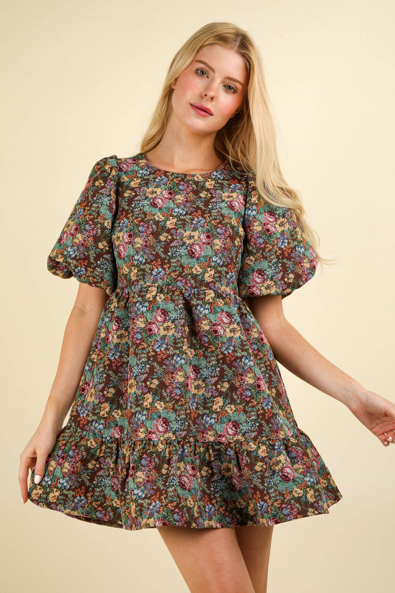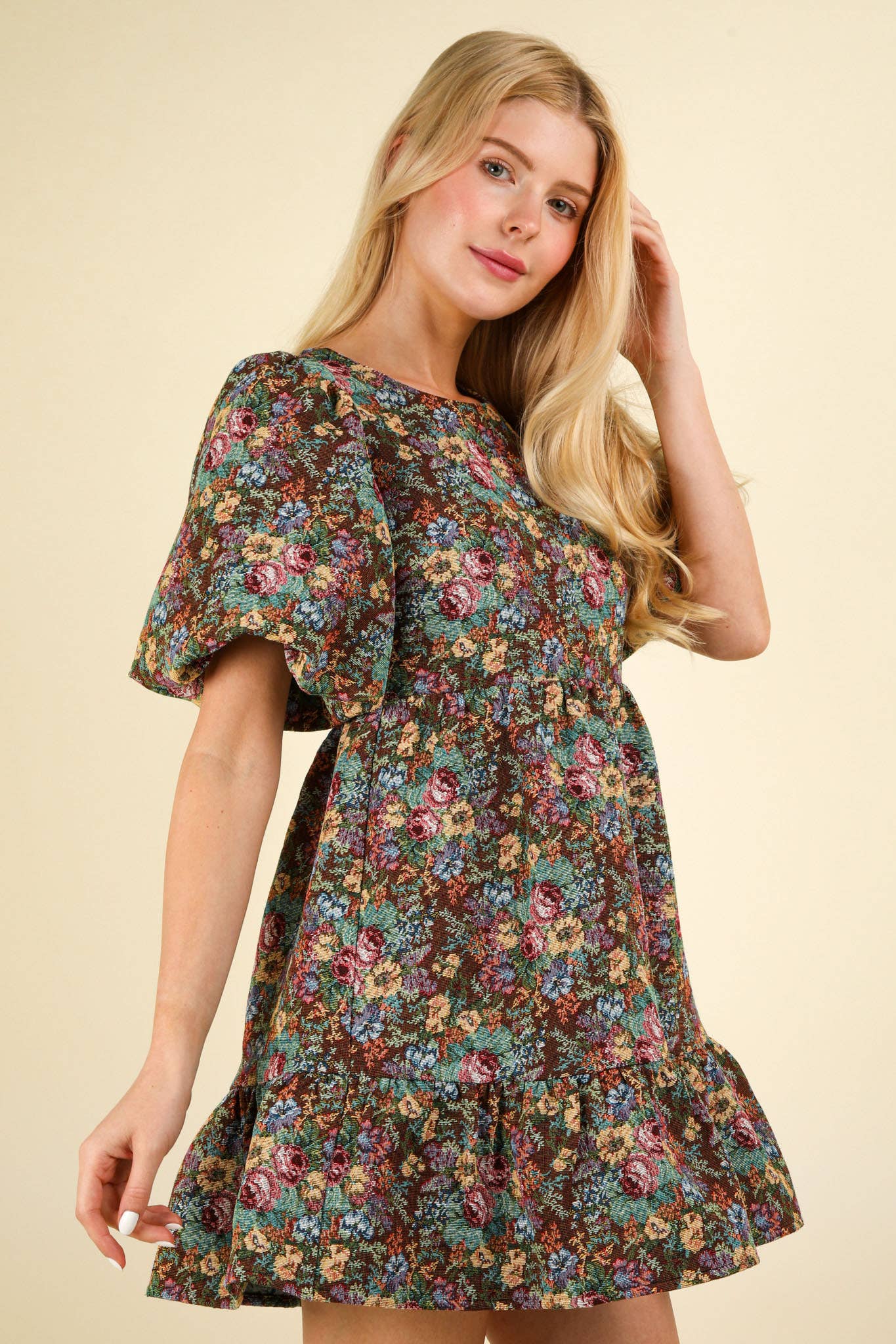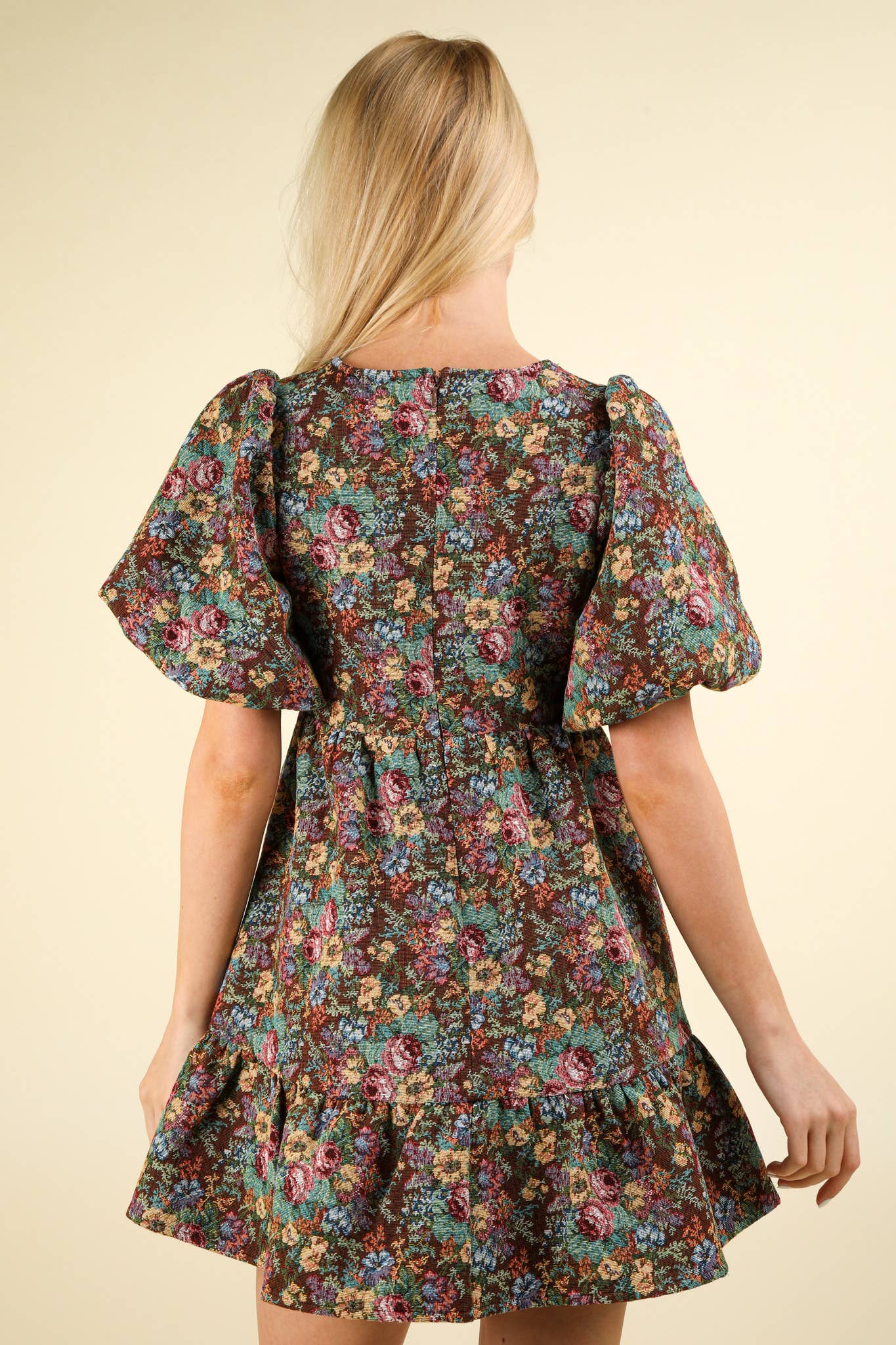 - Floral Jacquard Fabric Holiday Mini Dress - Soft Girl Style Short Puff Sleeve Dress with Back Zipper - Lovely Ruffled Hem Girlcore Dress with Round Neck (Model height: 5"7", wearing a Small, 2-2-2 Size Ratio, NEW IN)