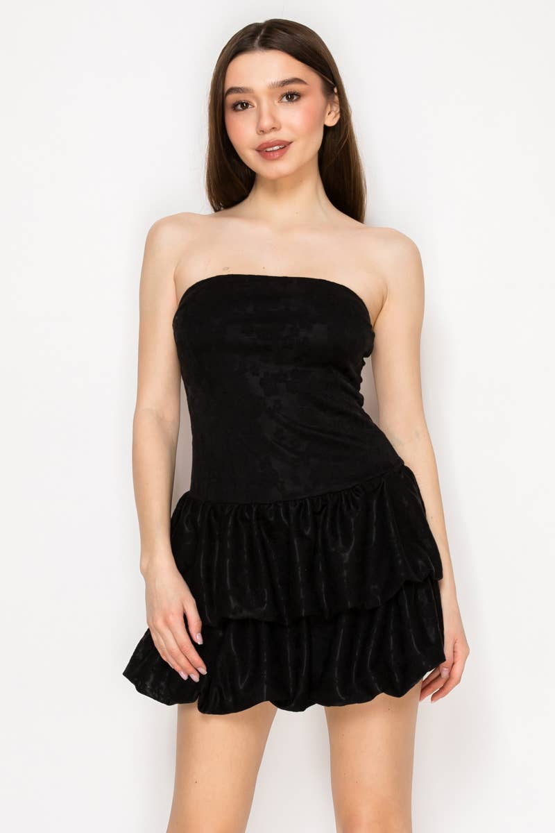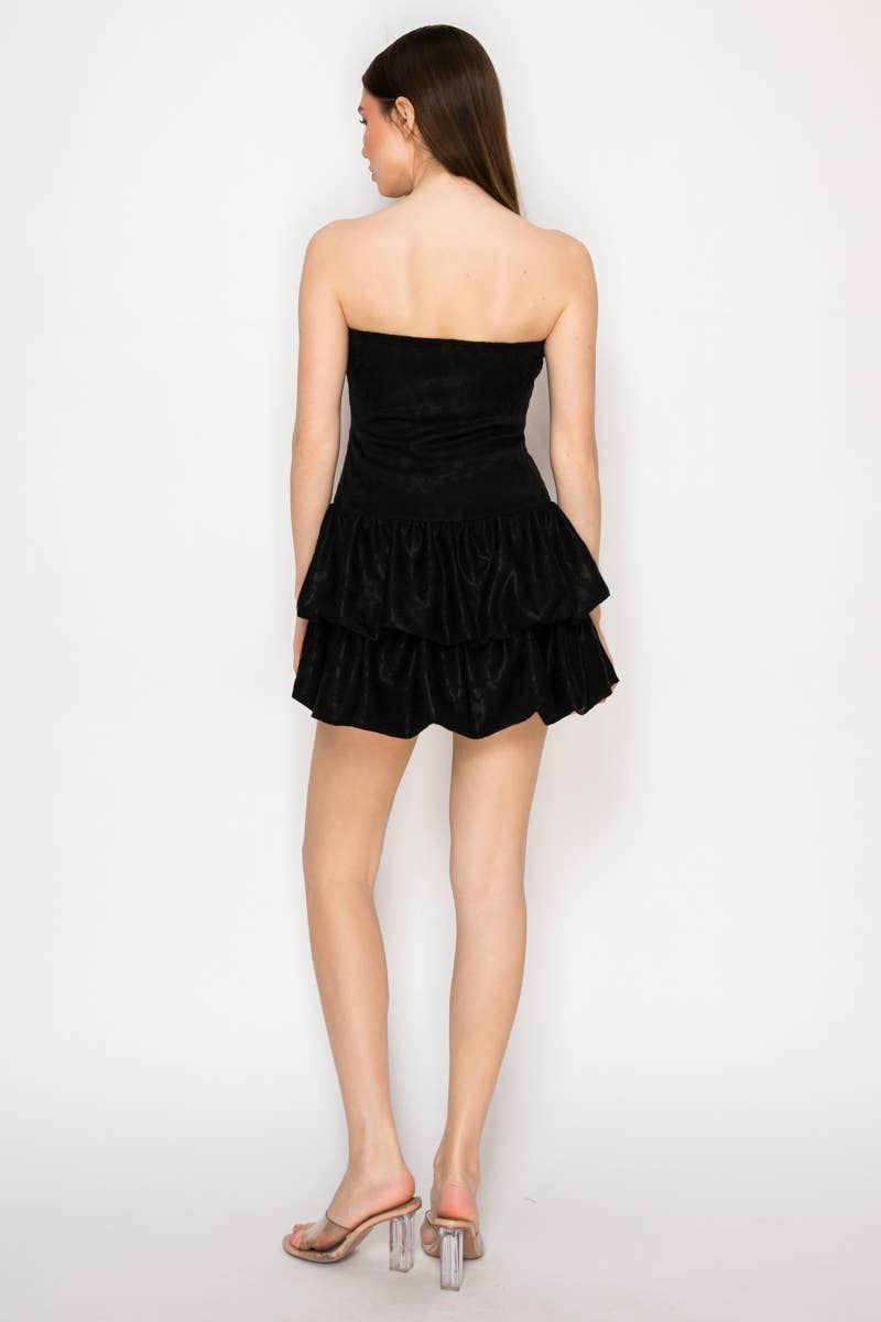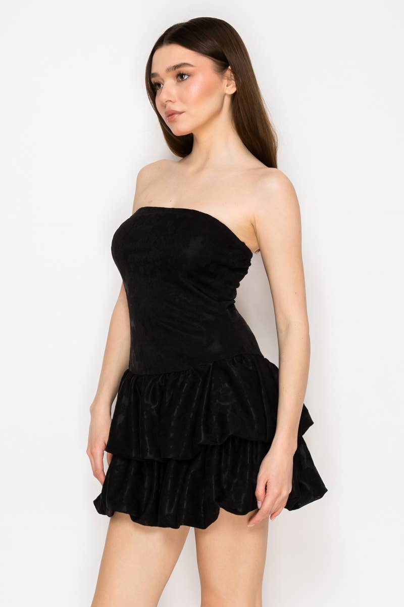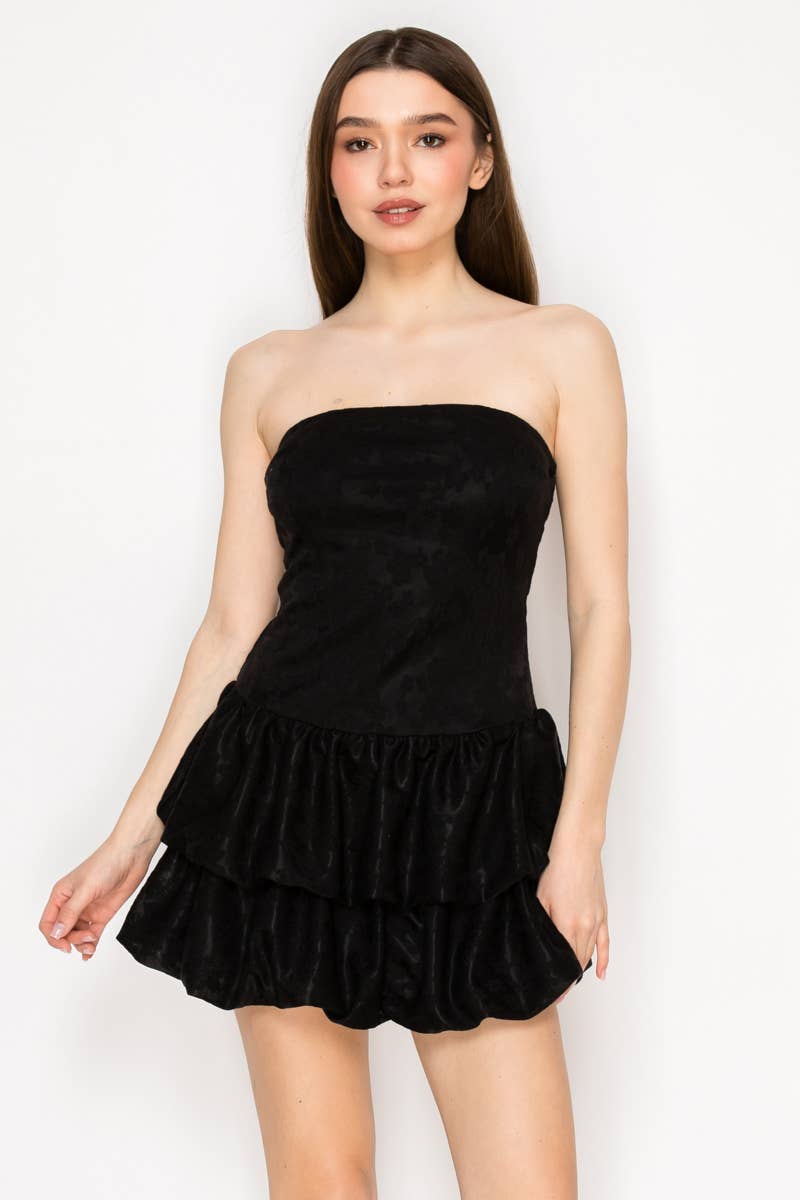 * Turn heads in this effortlessly chic strapless mini dress, featuring a soft cream hue and subtle floral jacquard texture. The form-fitting bodice hugs your curves in all the right places, while the double-tiered ruffle skirt adds playful movement and feminine flair