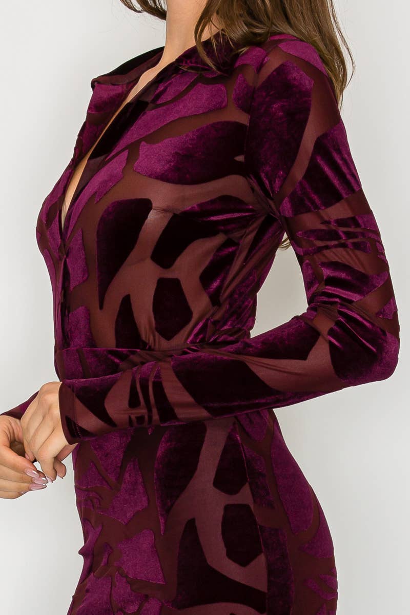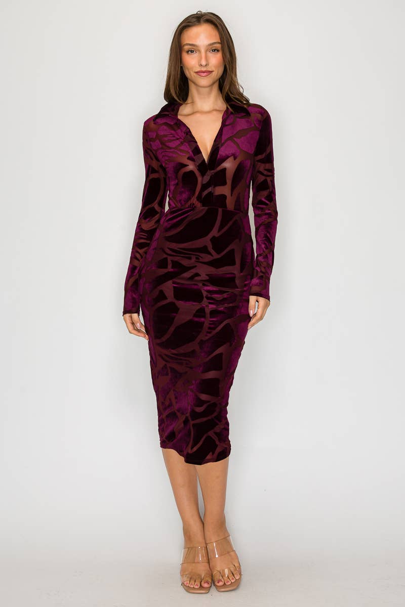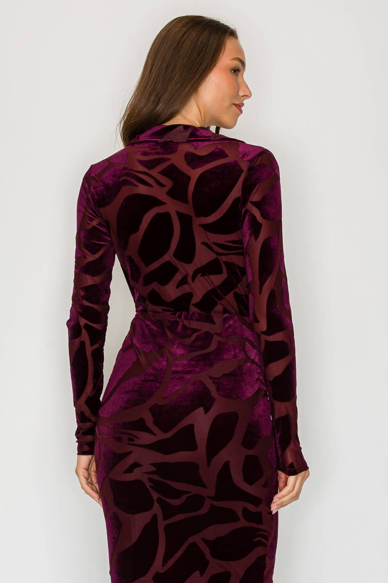 ICE VELVET BURN OUT MIDI DRESS: Burgundy /