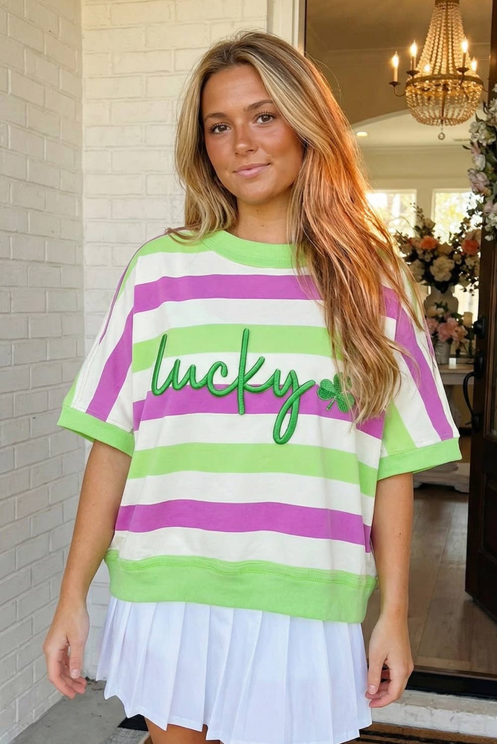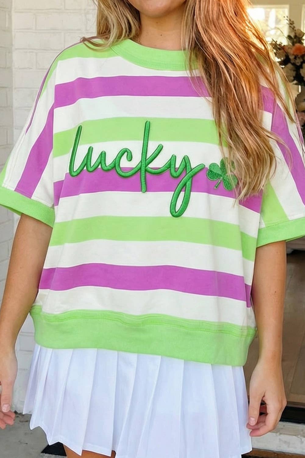 St Patricks Stripe Lucky Clover Embroidered Graphic Tee