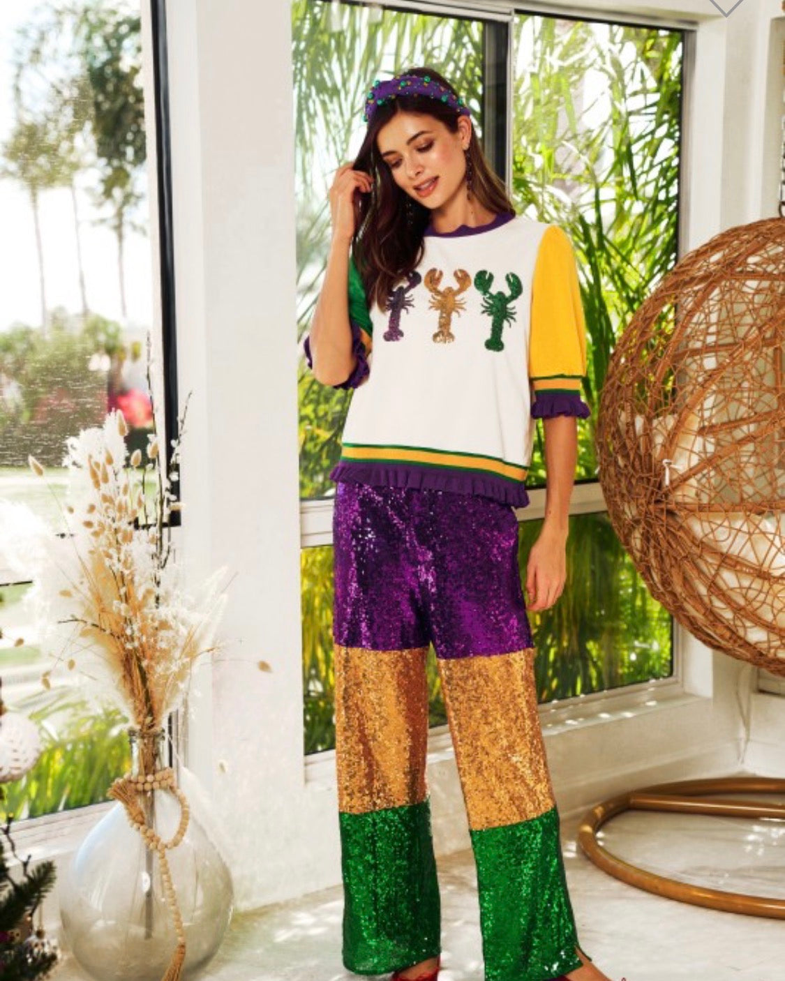 Celebrate Mardi Gras with these playful sequin striped pants. They offer easy comfort combined with a fun, bold look. Perfect for adding a festive touch to your casual wardrobe!