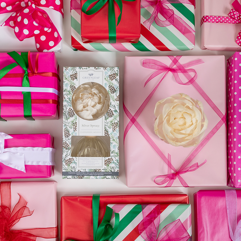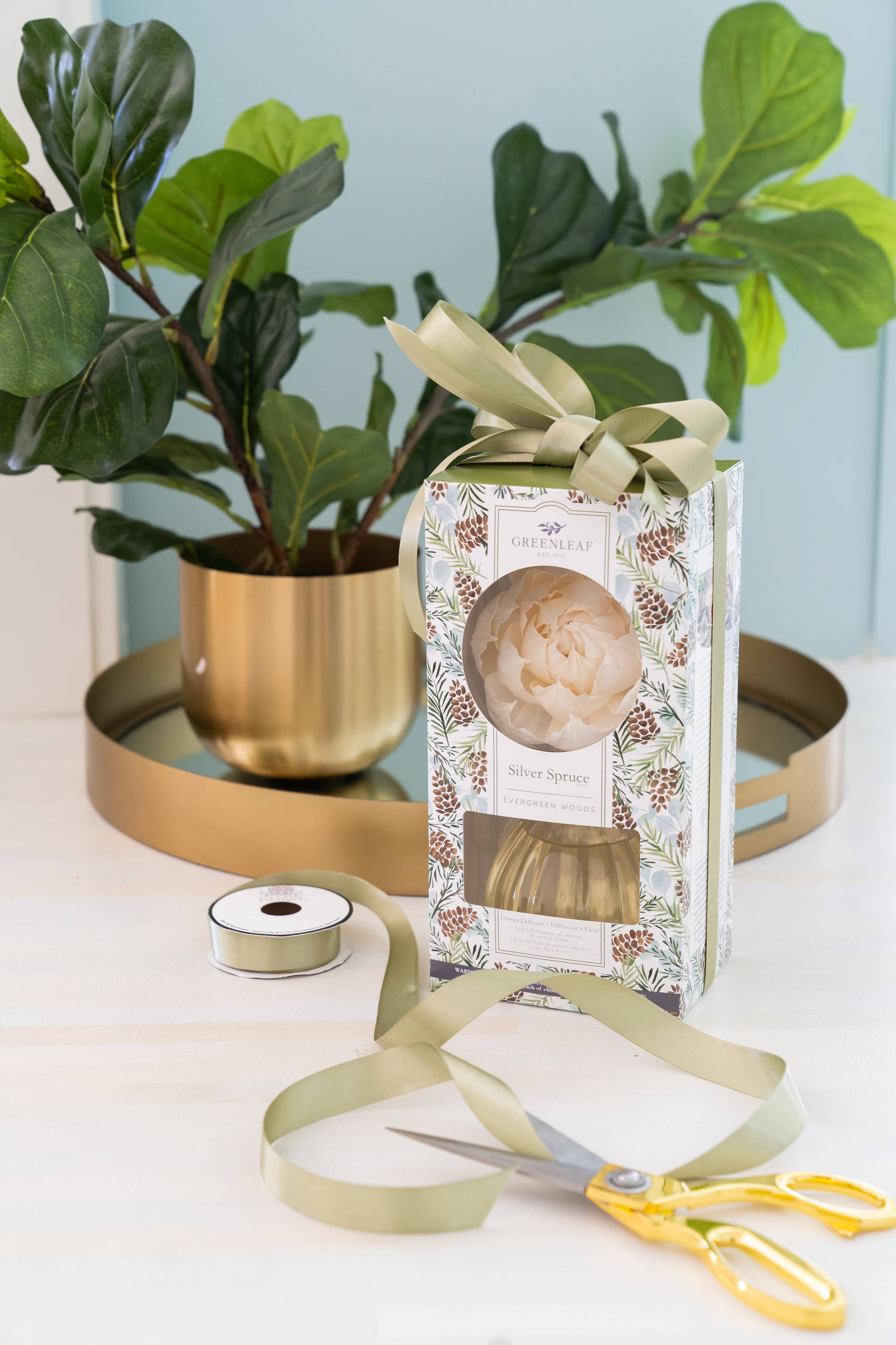 Greenleaf's Silver Spruce Flower Diffuser is the ultimate holiday hostess gift and a perfect addition to your christmas 2025gift selection. Our Flower Diffuser includes your favorite Greenleaf fragrance oil and a sola paper flower that emits a beautiful, blooming scent for up to 60 days! As the fragrance oils are absorbed through the wick, the flower begins to “bloom,” slowly emitting the fragrance and eventually resembling real flower petals. With the neutral color of the oil and the large flower, it will enhance and complement any space. Fragrance Description: A wintry wonderland mainstay, Silver Spruce encapsulates the magic of a snow-covered forest sparkling with the aroma of fir needles