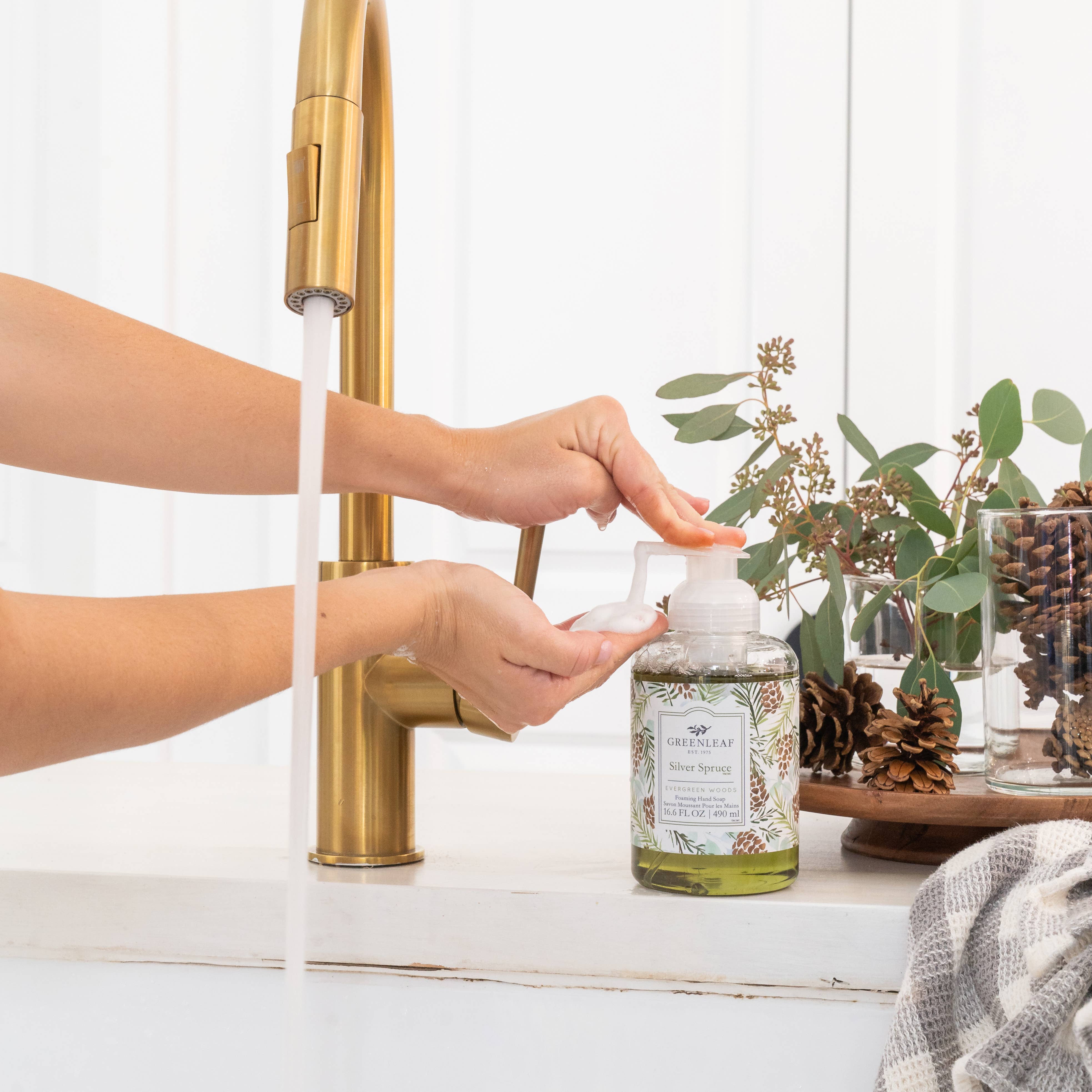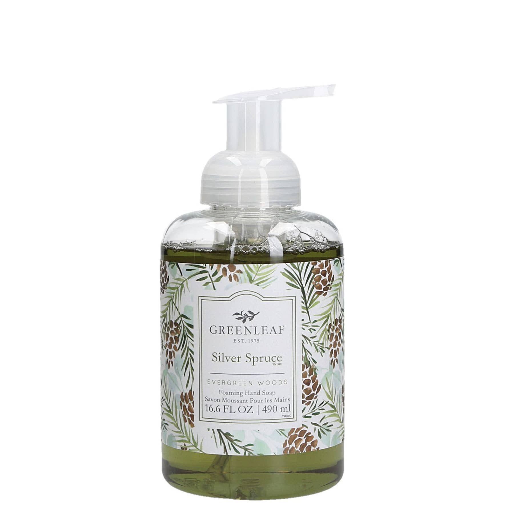 Greenleaf's Silver Spruce Hand Soap! Rich and indulgent, our foaming hand soap offers a luxurious fragrant lather designed to cleanse and refresh your hands. Infused with coconut oil, this gentle perfumed soap moisturizes while washing away dirt and leaving a light but beautiful fragrance on your skin. Fragrance Description: A wintry wonderland mainstay, Silver Spruce encapsulates the magic of a snow-covered forest sparkling with the aroma of fir needles, cedar wood, and sandalwood. Encounter the woody fresh grandeur each day with Silver Spruce.