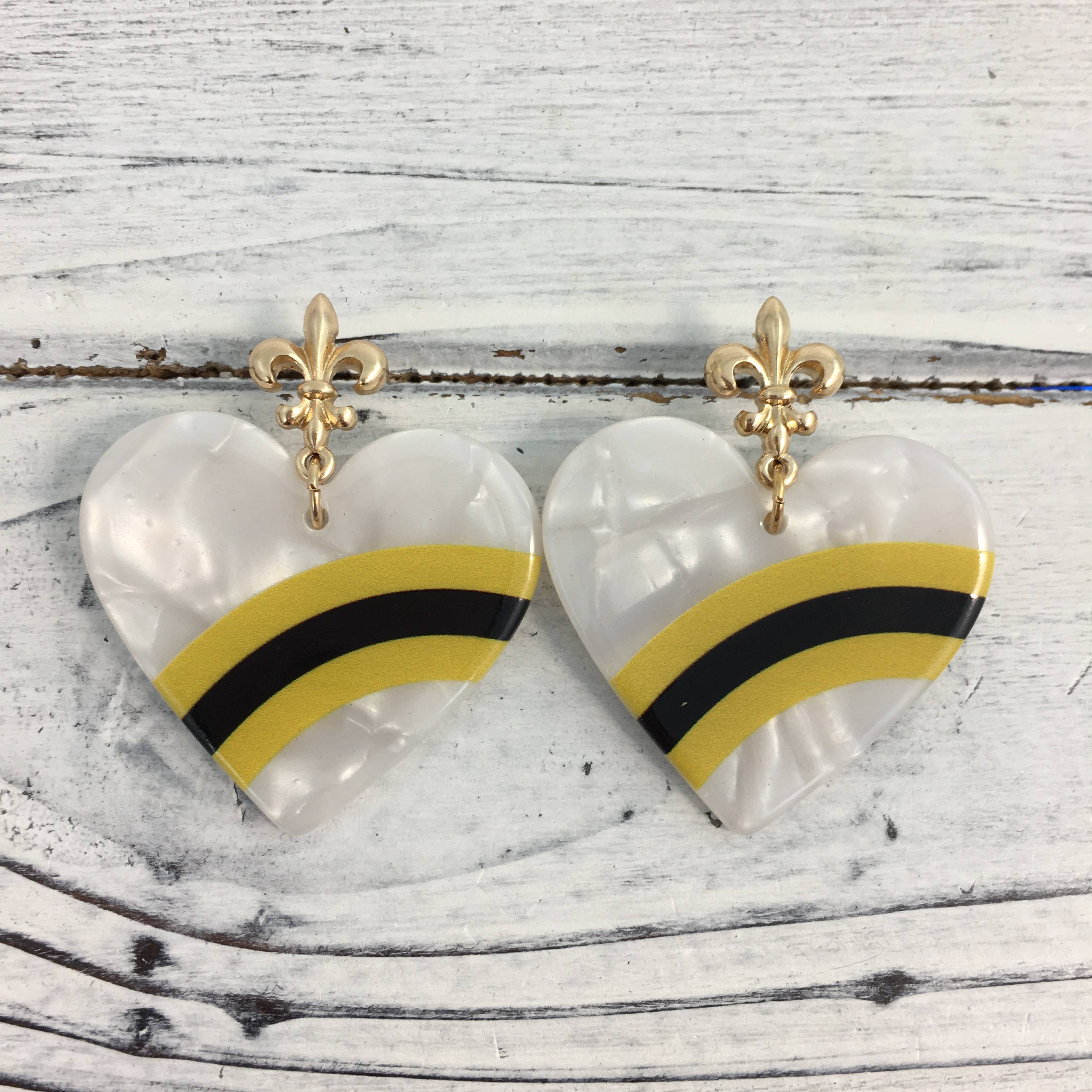 These are our black and gold heart earrings! These have a dainty fleur de lis as the post! These are so cute and perfect for game days and team pride! Find more in our Black and gold team gear collection!