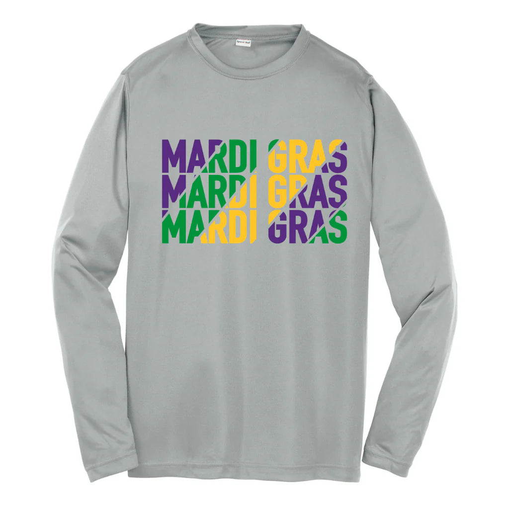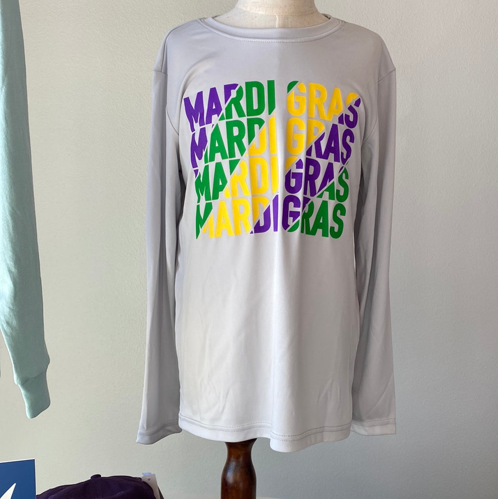 Gray performance long sleeve tee with repeating Mardi Gras