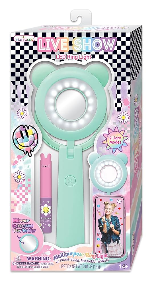 Hot Focus Live Show Accessory Set is the perfect complement for the trendy influencer. The led selfie light will illuminate and magnify the beauty of any picture or video. The cool vibes live show also has the cutest lipstick to complete the whole beauty experience. The perfect gift for any little girl dreaming of feeling like the next fashionista and with the lights versatility. Set includes: 1 x led ring light with phone stand/mirror/pen holder, 1 x lipstick, 1 x charging cable.